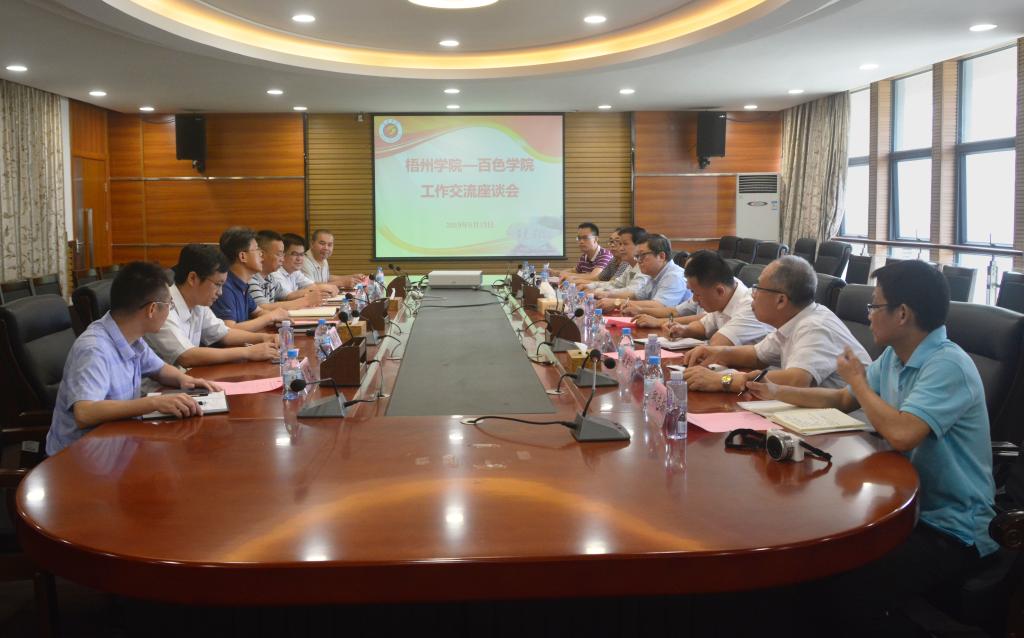 百色学院党委书记唐拥军(图左三)与杨奔校长一行座谈交流